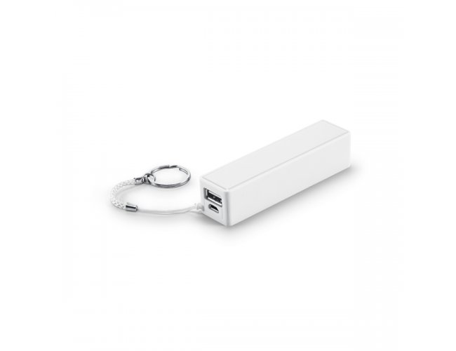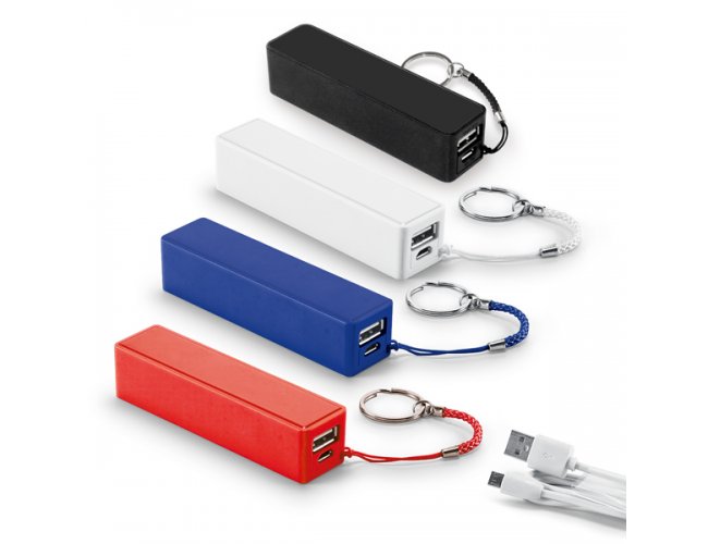Bateria portátil em ABS. Bateria de lítio com capacidade de 1.600 mAh, tempo de vida ≥ 500 ciclos e com entrada/saída 5V/1A. Incluso cabo USB