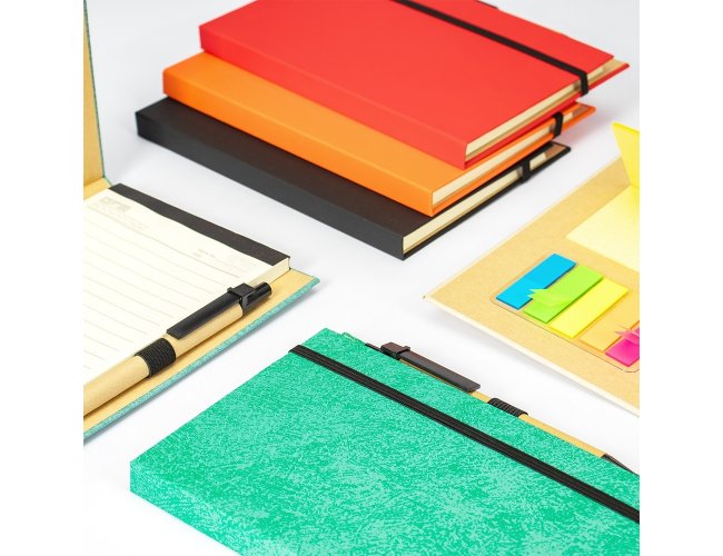 Um bloco de anotações com capa revestida em papel especial e fita elástica para fechamento. Contém aproximadamente 80 folhas amareladas destacáveis com pauta, além de um bloco com cerca de 20 folhas autoadesivas amarelas e aproximadamente 100 marcadores de página autoadesivos, divididos em cinco cores diferentes. Acompanha uma caneta esferográfica com carga azul de 1.0mm e acionamento por clique, corpo em papelão e demais componentes em plástico.