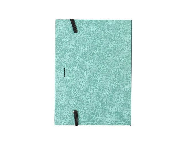 Um bloco de anotações com capa revestida em papel especial e fita elástica para fechamento. Contém aproximadamente 80 folhas amareladas destacáveis com pauta, além de um bloco com cerca de 20 folhas autoadesivas amarelas e aproximadamente 100 marcadores de página autoadesivos, divididos em cinco cores diferentes.