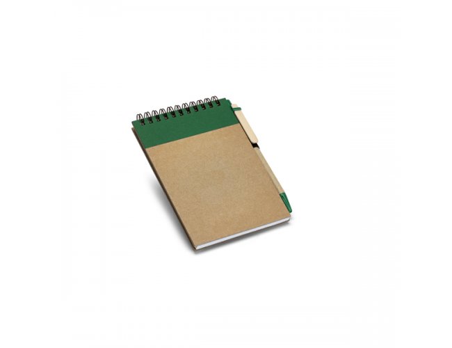 Caderno de bolso espiral de capa dura em cartão. Contém 120 páginas lisas em papel 100% reciclado e suporte para esferográfica (inclusa). Esferográfica com escrita em azul. 105 x 145 mm