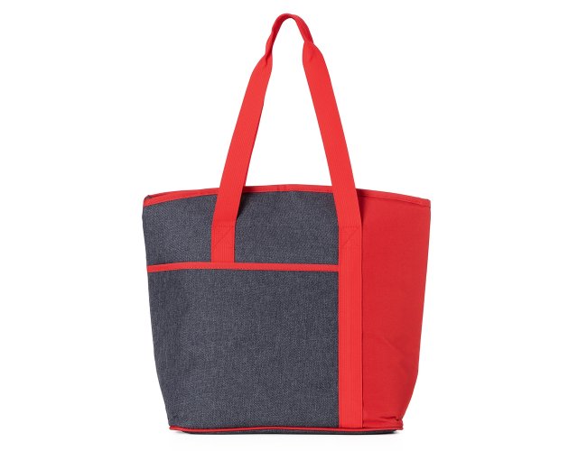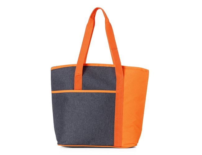Bolsa térmica de poliéster com capacidade de 15 litros, contém área interna com revestimento PEVA, bolso frontal externo e alças de mãos para transporte.