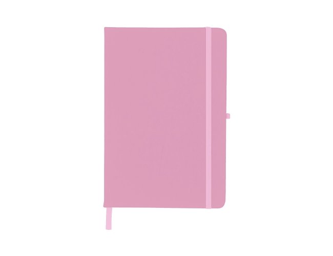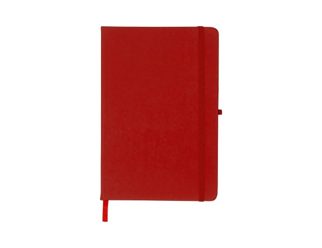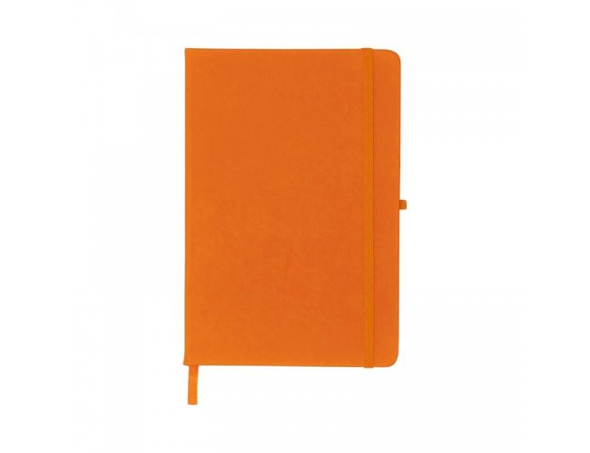 Caderneta emborrachada com porta caneta elástico em nylon, marcador de página em cetim e fita elástica de nylon para fechar. Contém aproximadamente 80 folhas pardas sem pauta.