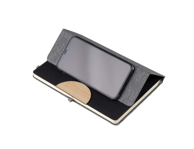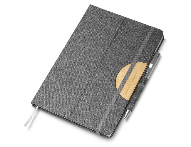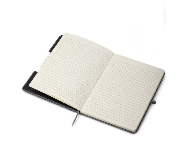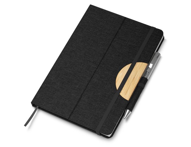 Caderno de anotações com suporte para caneta, fechamento com elástico, capa dura em material reciclável, suporte para celular na capa e miolo com 80 folhas pautadas na cor bege. NÃO ACOMPANHA CANETA.