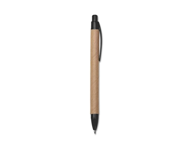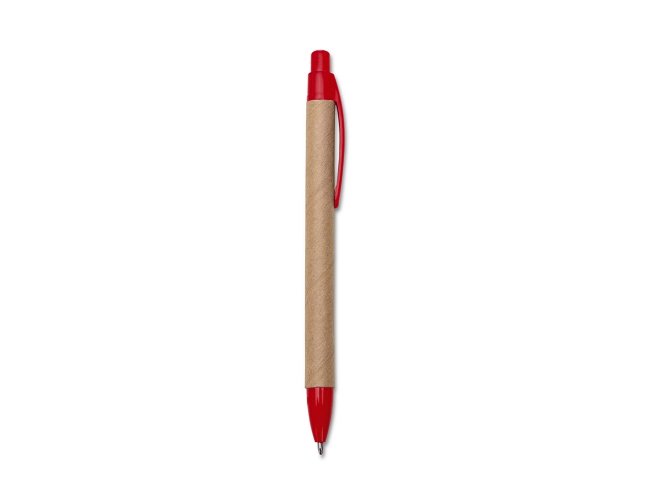 Caneta ecológica de papelão com detalhes coloridos, o clip pode facilmente ser retirado para personalização no corpo da caneta. Clip e ponteira plástica, aciona por clique.