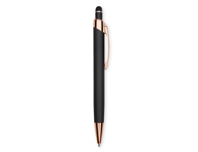 Caneta metálica com carga esferográfica azul de 1,0mm e acionamento por clique de revestimento emborrachado para interação em dispositivos com telas sensíveis ao toque.