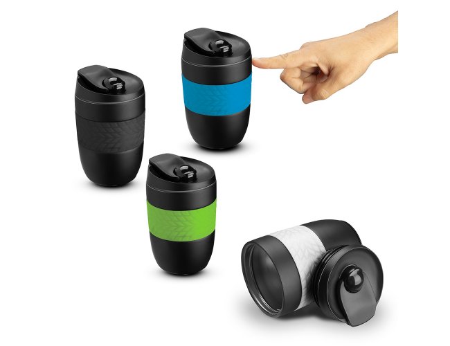 Copo antiqueda em aço inox parede dupla de 260ml, conserva temperatura quente ou fria, pegador em silicone e bico com tampa. Na parte inferior da caneca existe uma ventosa que por sucção previne possiveis quedas causadas por batidas, choques e colisões.