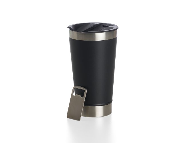 Copo térmico de inox com acabamento liso e capacidade 500ml, material livre de BPA. Contém tampa com abridor.