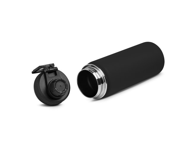 Garrafa em aço inox com capacidade de até 780 ml. Tampa rosqueável, alça em plástico e anel de silicone para vedação. Design com frisos na tampa e pintura pó.