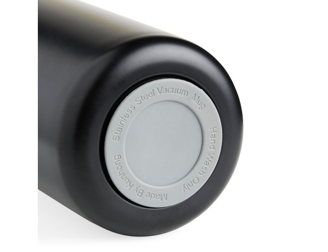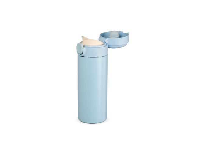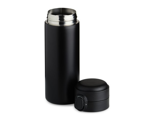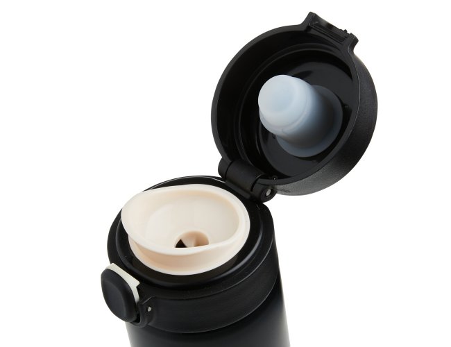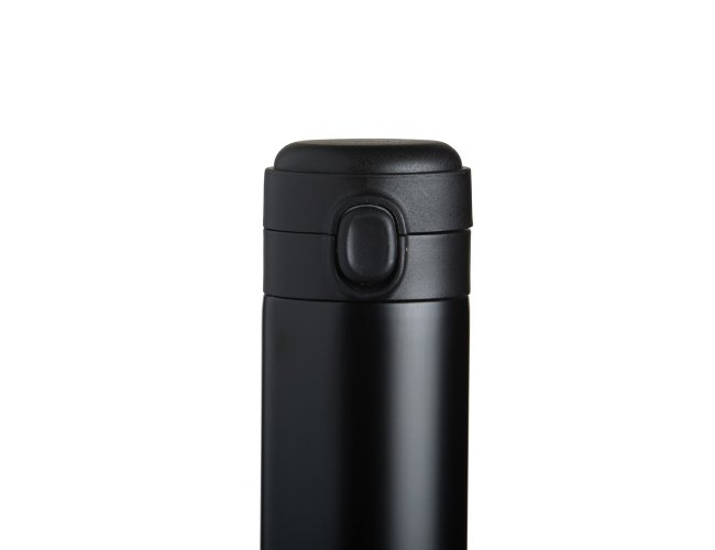 Garrafa térmica em inox com parede dupla, capacidade de 400ml. Tampa com botão central para abertura e borracha interna para vedação.