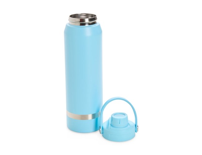 Garrafa térmica em inox 304 com capacidade para até 800ml. Possui estrutura de parede dupla e vedação a vácuo, permitindo a conservação da temperatura de líquidos por mais tempo. Conta ainda com tampa plástica rosqueável com protetor para o bocal, além de alça para transporte.