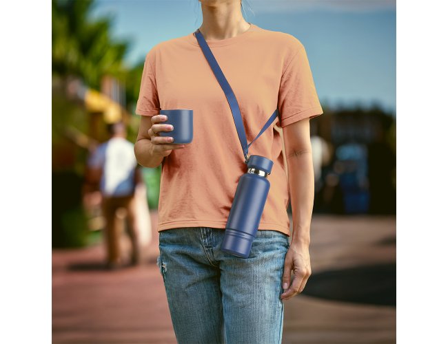 Garrafa térmica em aço inox com parede dupla isolada a vácuo e capacidade de 500ml. Alça de transporte em cordão. Tampa rosqueável, vedada por um anel de silicone e com uma argola tipo mosquetão para o cordão.