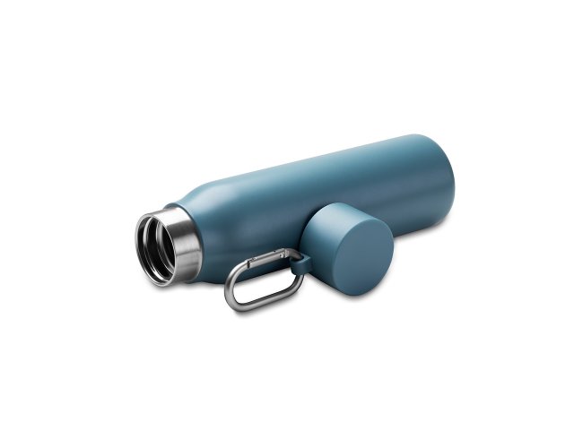 Garrafa Térmica de 550 ml com parede dupla em inox reciclado (externo 304 / interno 201), tampa em plástico PP, mosquetão em alumínio e acabamento com pintura a pó.