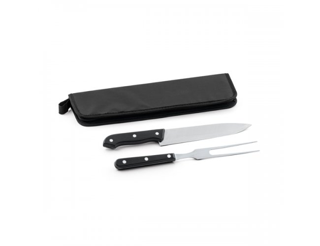 Kit churrasco. Aço inox e PP. 2 peças em estojo de 210D. Food grade.