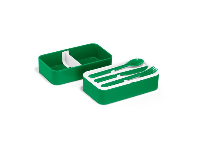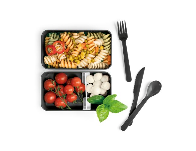 Marmita em PP e PS com 2 compartimentos (680 mL cada) e 1 divisória removível. Incluso 3 talheres: garfo, faca e colher. Fecha com banda elástica e está apta para micro-ondas, retirando a tampa. Certificação EU Food Grade.