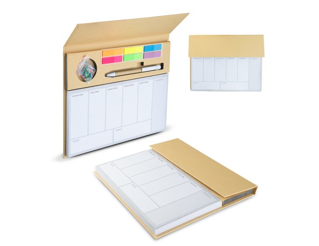 Mini caderno em papel Kraft, contendo: Bloco de Planejamento Semanal em português, com 100 folhas; 6 Sticky notes coloridos; 1 Caneta de Papelão; Acompanha clipes coloridos.