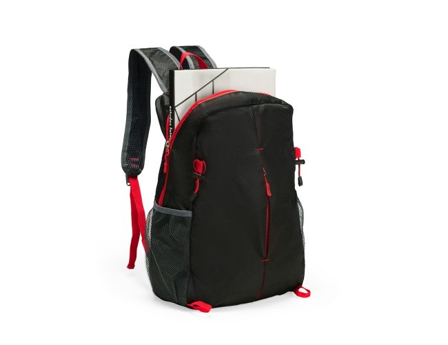 Mochila dobrável confeccionada em poliéster impermeável e detalhes em plástico, com fechamento em zíper e capacidade máxima de 16 litros. Possui compartimento interno com divisória para notebooks de até 15,6 polegadas. Conta com bolso frontal com zíper, dois bolsos laterais em tela com elástico, alça superior em nylon e duas alças traseiras com tecido telado interno. Acompanha saco em nylon com regulagem, que facilita o transporte quando dobrada.