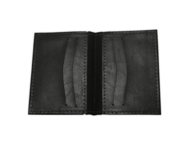 Porta cartão em couro sintético com quatro divisórias e dois bolsos internos.