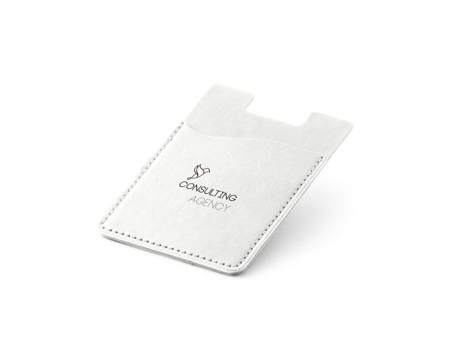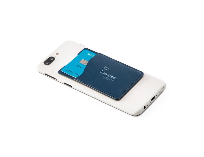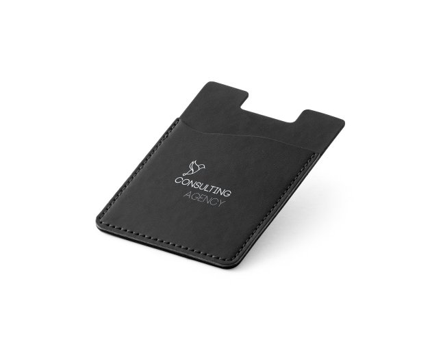 Porta-cartões para celular em PU com bloqueio de RFID, capacidade para 1 cartão e autocolante no verso. 92 x 62 x 3 mm