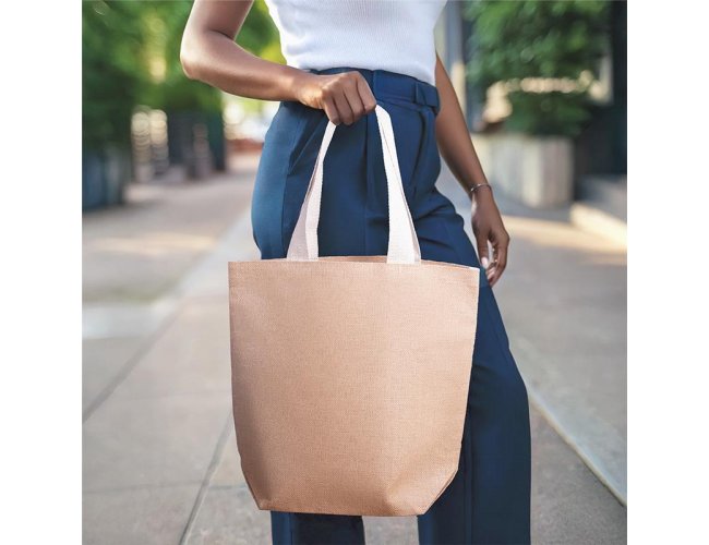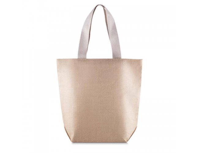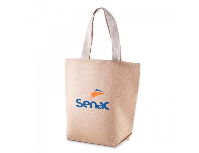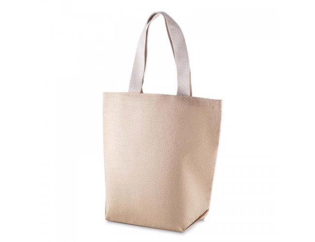 Sacola em Juta 360g/m² com alça em algodão cru e base plana ,interior revestido em plástico PP. Alça com altura de 24 cm, ideal para transporte.